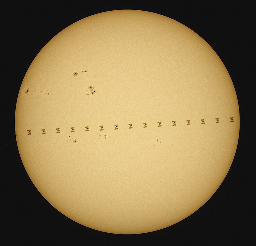 Bernd Liebscher gelang es, dieses seltene und schwierig einzufangende Ereignis aufzunehmen. Die ISS braucht nur wenige Sekundenbruchteile für den Vorbeiflug vor der Sonne.