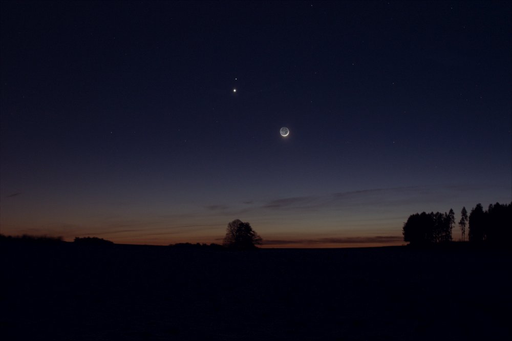 Am Abend des 20.02.2015 zog die junge Mondsichel an den beiden Planeten Venus und Mars vorbei, die von der Erde aus dicht beieinander standen. Diese nahen Begegnungen von Planeten am Himmel werden Konjunktionen genannt.