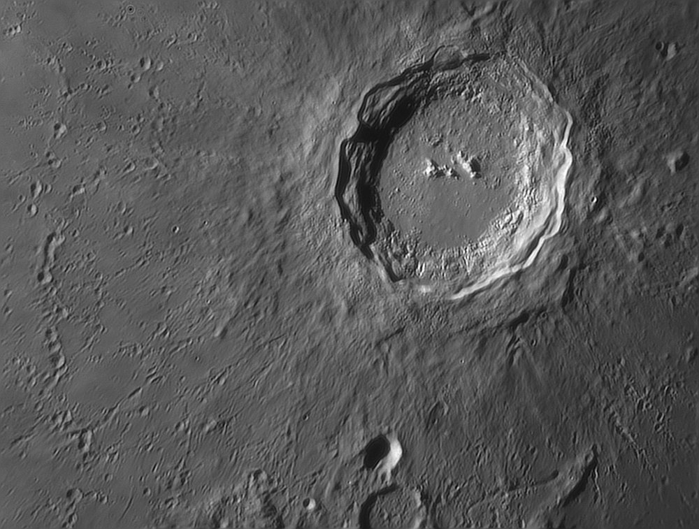 Der Krater Kopernikus befindet sich rechts der Mitte der uns zugewanten Mondseite. Ähnlich wie beim Krater Tycho, ist er Ausgangspunkt eines Strahlensystems von hellen Auswurfmaterial, dass besonders bei Vollmond gut zu sehen ist. Er hat einen Durchmesser von etwa 93km. Die Hänge des Kraterrandgebirges fallen terrassenförmig beinahe 4km zum Grund des Kraters ab.