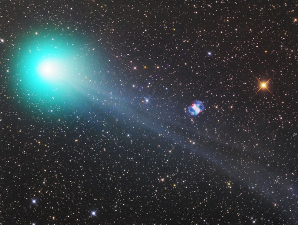 M76 ist mit etwa 3400 Lichtjahren natürlich viel weiter entfernt, als es der Komet zu diesem Zeitpunkt war. Die scheinbare Nähe ergibt sich nur perspektivisch aus der Sicht von der Erde.