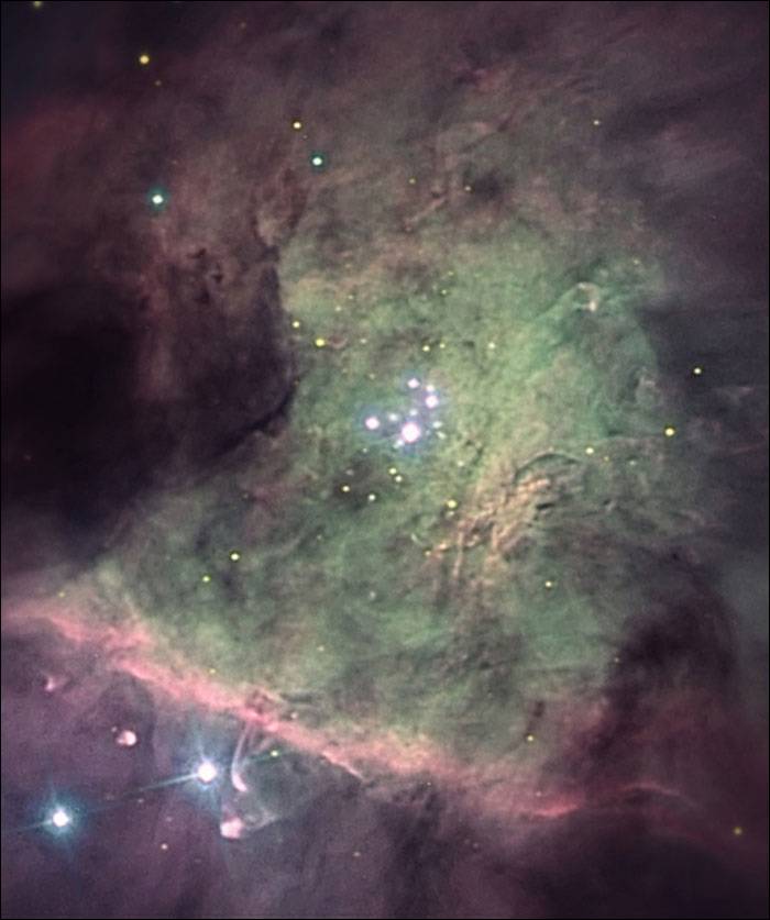 Dies ist eine Detailaufnahme, die das Zentrum des Orionnebels zeigt. Wie schon beim Bild des gesamten Nebels beschrieben, ist der Orionnebel ein sogenannter Emissionsnebel, der in ca. 1500 Lichtjahren Entfernung liegt und einen Durchmesser von 25 Lichtjahren besitzt. Der Orionnebel ist außerdem als eines der aktivsten Sternentstehungsgebiete bekannt.