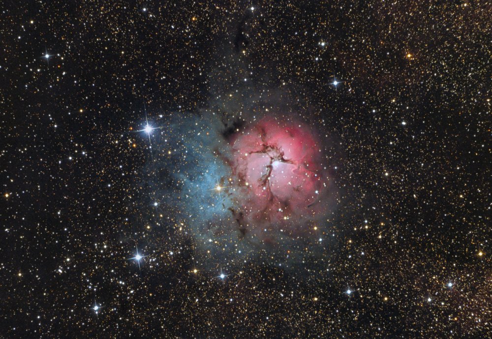 Der Trifidnebel (M20) ist ein Emissions- und Reflexionsnebel im Sternbild Schütze. Der Name leitet sich von der Dreiteilung des Nebels durch dunkle Staubbänder ab. ähnlich dem Orionnebel oder den Lagunennebel, ist auch der Trifidnebel ein Ort, in dem neue Sterne entstehen. Er befindet sich in einer Entfernung von 5200 Lichtjahren zur Erde. Der blaue Reflektionsnebel links gehört physikalisch nicht zum roten Emissionsnebel. Er ist diesem vorgelagert.