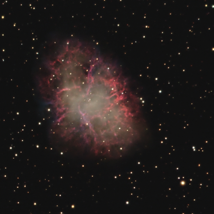 Der Krebsnebel (M1) ist ein Supernova-Überrest im Sternbild Stier.