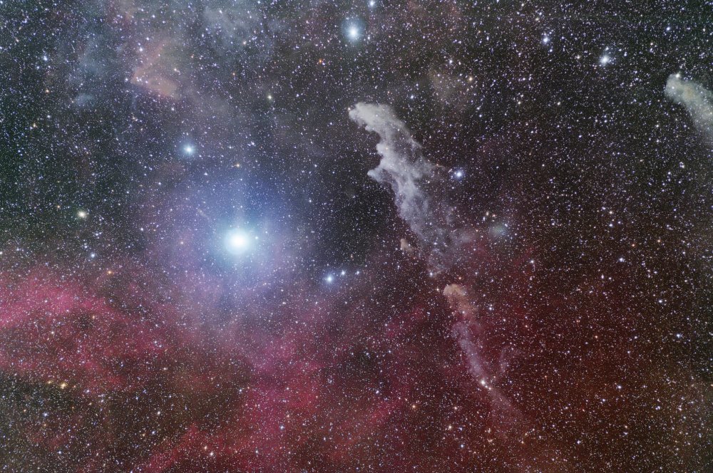 Der Hexenkopfnebel (IC 2118) ist ein extrem schwacher Reflexionsnebel, von dem angenommen wird, dass er ein alter Supernova-überrest oder eine Gaswolke ist, die vom nahe gelegenen Riesenstern Rigel (unten links im Sternbild Orion) beleuchtet wird. Er ist etwa 900 Lichtjahre von der Erde entfernt. Da Staubteilchen blaues Licht besser als rotes reflektieren, leuchtet der Hexenkopfnebel bläulich.