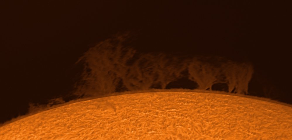 Eine Gruppe mächtiger Protuberanzen am Rand der Sonnenscheibe. Jede einzelne ist um ein vielfaches größer als die Erde.