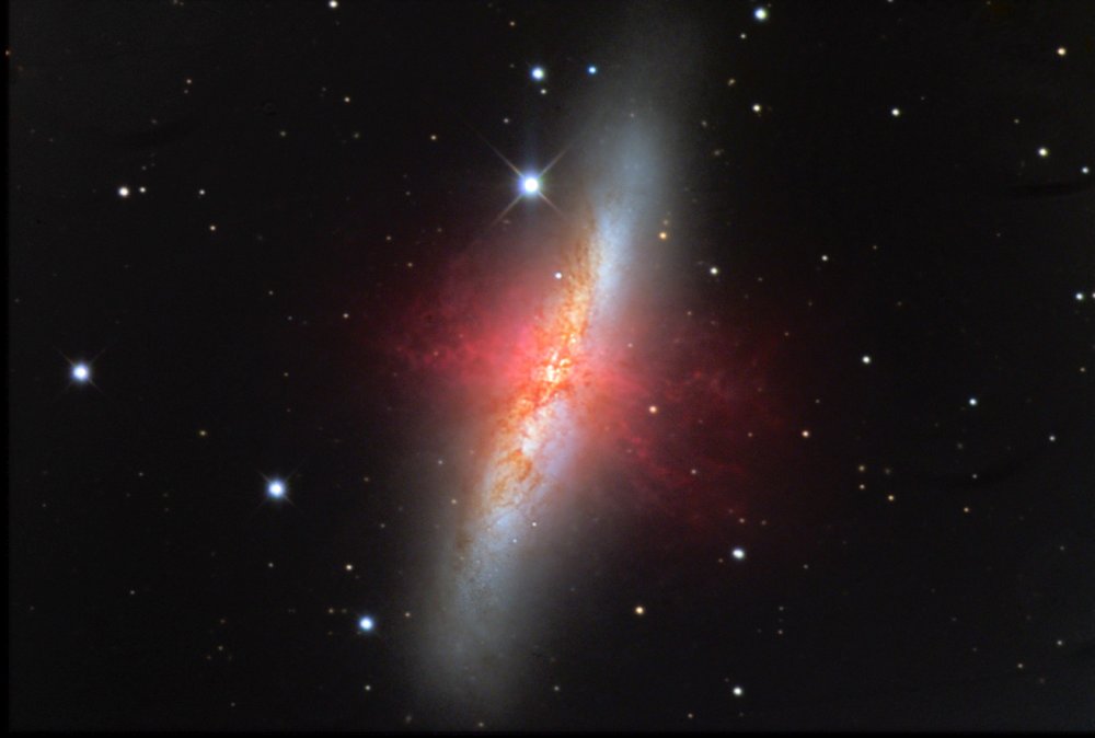 Durch die mit der hohen Stern-Entstehungsrate einhergehenden vielen Supernova-Explosionen, wird rot leuchtendes Wasserstoffgas aus der Galaxienscheibe hinaus geblasen. Dieses ist auf langebelichteten Fotografien gut sichtbar.